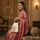 As seen on the model, this bag perfectly complements silk sarees, lehengas, and heavy salwar suits, especially those in jewel tones or rich silk textures. Its pale color ensures it matches a wide range of outfits.